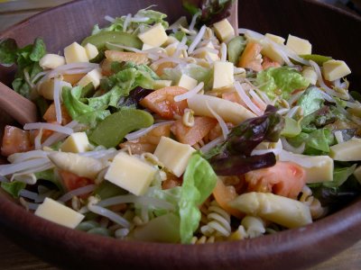 Preparación: En una sartén calienta las 2 cucharadas de aceite y sofríe el ajo, la cebolla y las papas hasta que estén doradas. Añade el queso parmesano molido y vierte en un recipiente. En la misma sartén tuesta las nueces y agrégalas a las papas. En una ensaladera mezcla la pasta con los pimientos, arúgula o berros, el vinagre, el aceite de oliva, las alcaparritas y la albahaca. Añade las nueces y papas y mezcla bien. Prueba y ajusta la sazón. Sirve con más queso parmesano rallado o pelado.